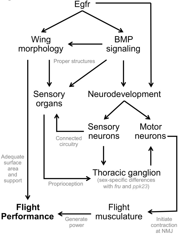 Working model for genetic modifiers affecting flight ability in a natural population. Fight performance has a complex genetic architecture, with the key developmental gene Epidermal Growth Factor Receptor (Egfr; human homolog EGFR) and the BMP signaling pathway contributing to wing and neurodevelopment. Both are both important for structuring the sensory organs that enable the fly to use mechanosensory channels for proprioception. Signals from the sensory organs on the wing, head, and body travel to the brain and thoracic ganglion. This ganglion acts as a flight control center, sending other signals through the motor neurons to the direct and indirect flight musculature for control of the wing angle and generation of power during flight, respectively. Functional genetic variation across genotypes was detected at each of these structures in our study.
